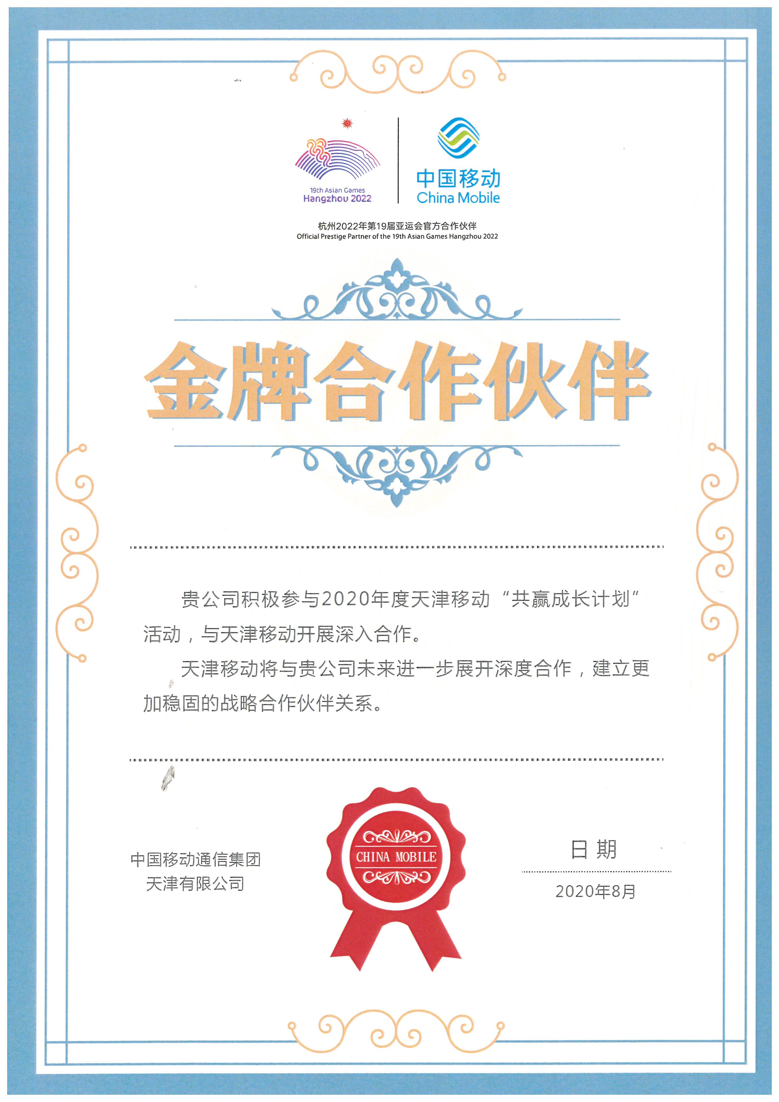 中國移動(dòng)通信集團天津有限公司金牌合作伙伴